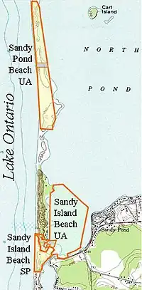 Sandy Pond Beach Unique Area is a 76-acre (31 ha) New York State conservation area located within the eastern Lake Ontario dunes. It lies at the north end of a spit of land dividing North Sandy Pond from Lake Ontario, and is about two miles (3.2 km) north of the developed portion of Sandy Island Beach State Park.[2] There is no road access to the area, which can be most easily reached by boat. For this reason, local residents have long referred to the beach as "Boaters' Beach". It has been managed as part of Sandy Island Beach State Park since 2011.