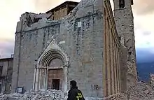 The remaining parts of the church were further damaged in the January 2017 Central Italy earthquakes, and the bell tower collapsed on 18 January,[2] while the right wall of the church collapsed on 29 January.[3] Only the portal and the left wall of the church remain standing.[4]