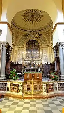 In the 20th century the area in front of the church was uncluttered from buildings. The interior layout is that of a Greek Cross. The dome is held up by four granite columns, while the apse is delimited by eight columns with 14th-century capitals. The presbytery has two paintings depicting Christ and the adulteress and Christ and the Centurion (1757) by Gaspare Serenario. The main 17th-century altarpiece depicts San Carlo Borromeo in procession painted by Giuseppe Salerno. The baptismal font was sculpted in 1755 by Francesco Pennino based on a design by Ignazio Marabitti. In the left apse you can admire some marble reliefs depicting the Passion of Christ by Antonello Gagini.