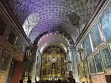 Between the severe exterior of the building and its interior floor there is an enormously striking contrast. The vaulted ceiling is studded with golden wooden flowers (in the Baroque style) that, having spaces in blue and yellow, reflect the two colors of the Immaculate Conception. Also with altarpieces on both walls, mural painting, starry latticework and a collection of oil paintings, they cover the walls without leaving a single empty space.