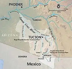 The city of Nogales, Sonora, has been releasing treated sewage into the Santa Cruz River since 1951.[7] This has resulted in the revival of approximately 9 miles (14 km) of riverbank within and north of the city of Nogales, Arizona.[8]