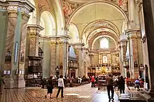 The fourteen canvases depicting the Via Crucis were painted by Antonietta Bisi of Milan. The main altar houses a venerated medieval crucifix, attributed to the Blessed Giacomo Oldo Lodigiano.[3] The interiors include frescoes by Carlo Innocenzo Carloni and his studio. An altarpiece of the Crucifixion is by Robert De Longe, called il Fiammingo. Beside the church are remnants of the 12th century church.[4]