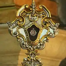 | Attributes | A palm branch in the right hand, cross on left, crocodile under her feet, diadem, sash |