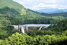 The Santeetlah Dam forms the Santeetlah Reservoir, which covers approximately 2,881 acres (1,166 ha), normal full pool area, with a drainage area of 176 square miles (460 km2) and stretches to Robbinsville, North Carolina. The elevation of Santeetlah Reservoir is 1,940.9 feet (591.6 m) according to the USGS. The dam is 212 feet (65 m) high and 1,054 feet (321 m) long, and was one of the first structures built using vibratory damping to control concrete quality. It has two spillways with a capacity of 50,000 cfs. It is topped by concrete gatehouse which controls water flows into the five mile tunnel running to the Little Tennessee.[2] The project's major elements were listed on the National Register of Historic Places in 2004.