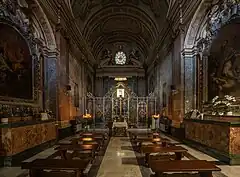 In 1587, when the church of Sts Sergius and Bacchus in the Roman Forum was suppressed as a cardinal deaconry, and the church demolished, it was succeeded by a renovated Sts Sergius and Bacchus in Monti. In 1622 it was entrusted by Pope Gregory XV (1621–23) to the Minim Friars of St. Francis of Paola who soon left it when they moved to another church near San Pietro in Vincoli.[4][6] The church was renovated under Pope Urban VIII (1623–44), through the patronage of his younger brother, Capuchin Cardinal Antonio Marcello Barberini (1569-1646, cardinal from 1624). [4] [6] Above the travertine doorway, the only part of the seventeenth century façade surviving today, is an inscription that records this work: