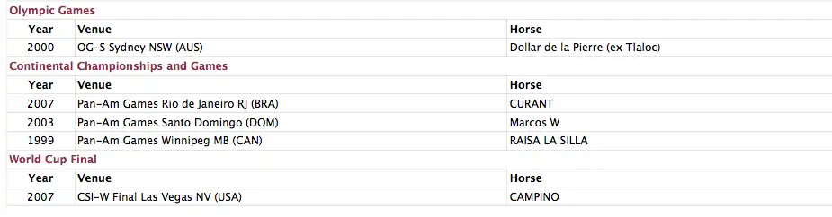Santiago has represented Mexico in various Nations Cups and world Tournaments and has won over 100 international competitions during his career as a Mexican rider.