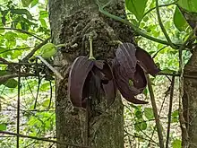 The flowers are dark purple when mature and emit amines such as putrescine and cadaverine which mimic the smell of a rotting carcass to attract target pollinating agents such as flies.