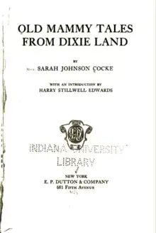 Sarah Johnson Cocke (née, Johnson; after first marriage, Hagan; after second marriage, Cocke; February 7, 1865 – January 20, 1944) was an American writer and civic leader. She was also active in several women's clubs. Cocke's works of Southern fiction include, Bypaths in Dixie, Master of the Hills, and Old Mammy Tales from Dixie Land. A memoir, A Woman of Distinction: From Hoopskirts to Airplanes, a Remembrance, was published posthumously.