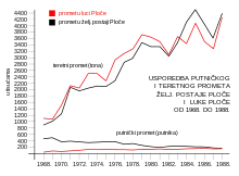 With the electrification of the railway, goods traffic recorded constant growth. So in Ploče railway station in 1969, the turnover of goods amounted to 1.03 million tons. Already in 1971, the turnover doubled (2.09 million tons), reaching 2.86 million tons in 1977 and 3.61 million tons in 1987. At the same time, passenger traffic was declining: 482,000 passengers departed from the Ploče railway station in 1969, 384,000 in 1971, 296,000 in 1977, and 173,000 in 1987.[29]