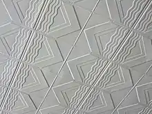 The ceiling is in fibrous plaster that, apart from flat sections, uses four decorative elements of what might be termed late Art Deco, but not Art Moderne. They are flat ribs, ribs of cross fluting, longitudinal panels of shallow Vee section, and longitudinal flutings. The small cornice is also fluted vertically. The ceiling is painted all-over cream at present.[1]