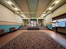 Upon entering the front doors one is in a commodious carpeted rectangular foyer. (The foyer was also carpeted when the building was reopened in 1940; wall-to-wall carpet being indicative of a luxury rarely seen in domestic environments.) The present design gives a modest impression of Art Deco in buff and brown tonings.[21][1]