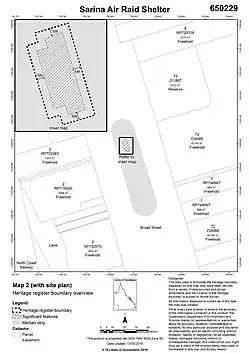 1. 1 2 3 4 5 6 7 8 9 10 11 12 13 14 15 16 17 18 19 20 21 22 23 24 25 26 27 28 29 30 31 "Sarina Air Raid Shelter (former) (entry 650229)". Queensland Heritage Register. Queensland Heritage Council. Retrieved 18 August 2021.