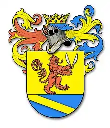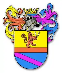 Another group, originally from Enego, obtained citizenship of Vicenza in 1582, and by 1599 they already had coats of arms. This group used at least two other variants of this coat of arms: one with the gold lion and the silver scissors, and another documented in Bassano del Grappa in 1615 at his tomb in the Church of Saint Francis, with the green lion, the gold upper field, the purple band and a red band between the two fields.[38]