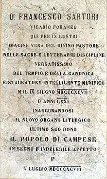 Lápide commemorativa da beneficência de don Francesco Sartori, instalada na igreja paroquial de Campese, 1898.