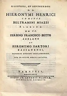 Cover of Eulogium, panegyric addressed to Count and Bishop Girolamo Miazzi, written by Girolamo Sartori and Francesco Zerbino Betti, his blood relatives, 1779.