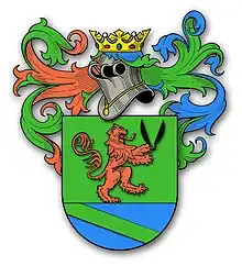 Variant of the coat of arms of the Bassano del Grappa group, dating from the 17th century. In the 18th century, another slightly different variant, with the green lion, was inscribed on the facade of the Sartori-Moritsch House.[38]