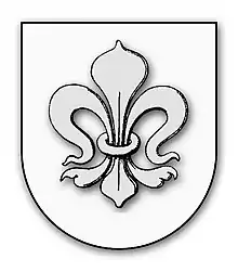 Presumed primitive form of the family coat of arms, engraved on the facade of a villa they owned in Roana. The villa was destroyed in World War I and the remaining description of the coat of arms is unclear. Its colors have not been described either. The lily, a traditional symbol of Florence, is probably a reference to their Florentine origins.[1][2]