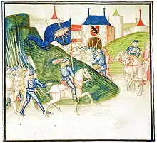 - ↑ Douglas Miller, Gerry Embleton, The Swiss at War 1300-1500, Men-at-arms series No. 94, Osprey Publishing, 1979, ISBN 978-0-85045-334-8, p. 27. Miller interprets the acorns as bait for the pigs: "a jester chasing a sow and piglets with a club and acorns as bait."