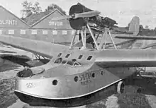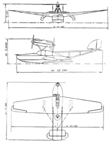The earlier S.55 carried its empennage on a pair of open, flat, triangular girders constructed from tubes, one from each hull. The S.63 used a similar arrangement, allowing its single, unusually wide hull to be short. Its bottom had a shallow, concave V-section and a single step. Lateral stability on the water was provided by outward-leaning, V-bottomed floats mounted a little outside the centre-section. The original bomber version had defensive ring-mounted machine gun positions in the nose and behind the trailing edge. A forward entrance led to the pilots' side-by-side open cockpit, offset to the left and ahead of the wing leading edge.[1] The airliner conversion separated the pilots into two symmetrically positioned, enclosed cockpits[3] and introduced a windowed 3 m × 3 m (9 ft 10 in × 9 ft 10 in) passenger cabin behind the cockpit which seated ten. Behind it there was a space for luggage and a wireless operator's compartment with access to the engines.[1]