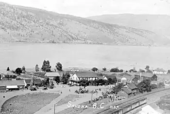 In 1870, James Uren purchased the W.H. Kay stopping house, which he refurbished and later extended.[50] In the early 1870s, James Sabiston operated a store.[51] Uren managed the HBC warehouse 1873–1878,[52] which held freight awaiting lake transport to Kamloops.[41] About 1882, he renamed the lodgings as Savona House.[52] John Jane's general store, which opened in 1881, soon faced competition from the various stores across the lake which sprang up to serve the CP construction crews.[53] Around this time, Abraham Thomas opened a saloon, which became known as the Central Hotel.[54] In fall 1883, James A. Newland and Adam B. Ferguson opened a hotel called Lakeview House,[55] which thrived during the CP construction period.[56] The location of the cemetery on the north shore suggests its existence by this time.