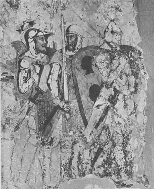 Fresco on the walls of a hall in the episcopal palace at Colle Val d'Elsa, depicting the departure of barons on a crusade. It probably represents the crusade of 1366, since the knight on the left is Amadeus VI. "The fresco is usually ascribed to the Sienese school and dated in the last half of the fourteenth century."[1]