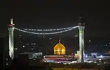 The shrine of Sayyidah Zainab is located in the south of Damascus where called Al-Sayyida Zainab. This area is part of Damascus Rif Province. The building of the shrine consists of a large courtyard with a square plan. It included a dome and two high minaret. The Minarets and walls of the courtyard and porches were tiled by Iranian artists, the roof and walls of the shrine were glazed from the inside and the dome was gilded from the outside. On the eastern side of the courtyard, the building of the Zeinabieh's prayer hall with a small courtyard has been built. A new courtyard has also recently been built on the north side of the Holy Shrine.[2] The shrine is sometimes seen by some as a place of miracles.[3]