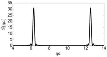 Structure factor S(qa) for N = 31 planes. Shown are the first and second Bragg peaks. It is worth noting that for a perfect but finite lattice, all peaks are identical. In particular, the peaks all have the same width. Also, the central part (between bracketing zeros) of each peak is close to a Gaussian function, but the envelope of the small oscillations either side of this peak is a Lorentzian function.