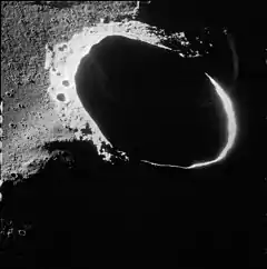 Oblique view of Schiaparelli from Apollo 15 just after sunrise, facing south.
