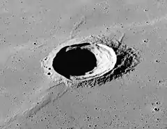 Schiaparelli (/ˌskæpəˈrɛli, ˌʃæp-/ SKAP-ə-REL-ee, SHAP-,[1][2] US also /skiˌɑːp-/ skee-AHP-,[2][3] Italian: [skjapaˈrɛlli]) is a lunar impact crater located on the western part of the Oceanus Procellarum, to the west of the crater Herodotus. The rim is relatively sharp-edged and relatively free from impact wear. The inner walls have slumped to form a shelf around much of the sides. The interior floor is somewhat irregular, but free from impacts of note.