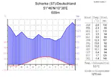 The average air temperature in Schierke is 5.3 °C, and it has an annual precipitation of 1,275 millimetres.