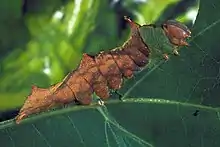 The larvae feed on Alnus, Malus, Populus tremuloides, Betula papyrifera, Ulmus, Crataegus, Carya and Salix species. They are brown, although the second and third thoracic segments are bright green. The head is mottled brown. Larvae can be found from May to October in the south and from June to September in the north. The species overwinters in its pupae stage in a cocoon beneath leaf litter.