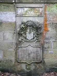 The castle's park, now open to the public, was greatly expanded in 1868 at the construction of the new Schloss with some newly acquired land. In this way, the municipal well, important to the water supply of the households of Ketschendorf, was included. The old source now feeds the castle's pond, which is located in the middle of the park. As a replacement for the no longer accessible community fountain, the Baroness donated the Karlsquelle, named after her son, to the Wassergasse, next to the former forge. This bears in sandstone the Stolzenau-Ketschendorf coat-of-arms and an inscription panel. The well was moved from there after 1974, after the opening of the park to the public.