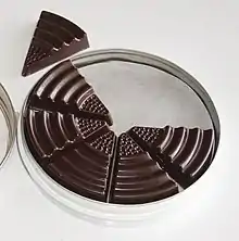 • Until recently, each container originally consisted of two individually stacked circular chocolate platters, embossed in a cakelike shape and portioning, where each individual embossed portion had to be broken off for consumption.