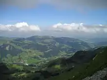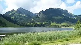 Schwarzsee (German: [ˈʃvartszeː]) or Lac Noir (French: [lak nwaʁ]; English: "Black Lake";[1][2][3] rarely Lac Domène; Arpitan: Lèc d'Omène [ˈle dɔˈmɛn(ə)] ), is a small lake in the Canton of Fribourg, Switzerland with an area of 0.47 km2 (0.18 sq mi). The lake in the Swiss Prealps is bordered by the peaks of Schwyberg (1,628 m) in the West, Les Reccardets (1,923 m) and Spitzfluh (1,951 m) in the South, as well as Kaiseregg (2,185 m).