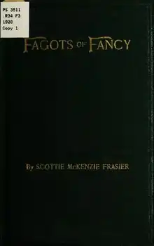 In 1920, Frasier issued a book of poems, Fagots of fancy.[1] Of Things That Are Mine (1923), a reviewer of Pearson's Magazine stated, "Scottie McKenzie ... has produced a volume of free verse unadulterated by music, imagination, or any other quality of poetry."[11] A Bookman reviewer was equally critical of the work:— "In Things That Are Mine (Steen Hinrichsen) Scottie McKenzie Frasier trills cheerfully and unabashedly over a few slurred and time worn poetic roundelays. Like the indefatigable robin - which bird might be called her mascot, so often does she wear it on her shoulder - Mrs. Frasier's song is yellow billed and trite, verging on the quack, bare of distinction save for an occasional felt word or phrase. It is this unrelieved authority, this brightness, this alertness which is the despairing feature of her verse. One feels that the author, like the robin, is too busy being assertive to listen to the secret stilly singing whence proceeds real creation."[12]