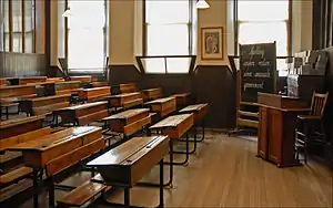 Under the Education (Scotland) Act 1872 approximately 1,000 regional School Boards were established[19] and, unlike in England where they merely attempted to fill gaps in provision, immediately took over the schools of the old and new kirks and were able to begin to enforce attendance, rather than after the decade necessary in England.[18] Some ragged and industrial schools requested to be taken over by the boards, while others continued as Sunday schools.[14] All children aged from 5 to 13 years were to attend. Poverty was not accepted as an excuse and some help was supplied under the poor law. This was enforced by the School Attendance Committee, while the boards busied themselves with building to fill the gaps in provision. This resulted in a major programme that created large numbers of grand, purpose-built schools.[18] Overall administration was in the hands of the Scotch (later Scottish) Education Department in London.[17] Demand for places was high and for a generation after the act there was overcrowding in many classrooms, with up to 70 children being taught in one room. The emphasis on a set number of passes at exams also led to much learning by rote and the system of inspection led to even the weakest children being drilled with certain facts.[18]