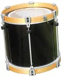 The Scottish tenor drum is a musical instrument used within Scottish pipe bands. It is a double-headed membranophone that is held vertically with one head up, one head down, and played with soft mallets on the top head only. Common sizes of drums are 15, 16, 18, or 20 inch in diameter, with 12, 14, or 16 inch depth. The playing style of the Scottish tenor drum has varied throughout the years, but there is typically a variation of the combination of swings (or flourishes) and rhythmic accompaniment to the Scottish snare drum and the Great Highland Bagpipes. It is similar to the more common marching band style tenor drum.