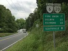 The main highways serving Scottsville are Virginia State Route 6 and Virginia State Route 20. SR 6 extends westward towards Waynesboro and eastward towards Richmond. SR 20 extends northward towards Charlottesville and southward towards Dillwyn.