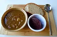 Scouse is particularly associated with the port of Liverpool. The recipe for scouse is fairly broad; it was traditionally made from leftovers and whatever was in season at the time. Guardian food writer Felicity Cloake describes scouse as being similar to Irish stew, or Lancashire hotpot, though generally using beef rather than lamb as the meat.[1] While ingredients can vary, those essential are potatoes, carrots, onion and chunks of meat, with beef favoured over lamb. These are simmered together for several hours. The meat may be seared first, then reserved while some of the potatoes are boiled; as they break up, thickening the mix, the meat and the rest of the potatoes are added, and the stew finished off.[1][2]