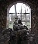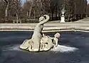 Appearing at the base of the grotto are four tritons—creatures who are half-man and half-fish—who are part of the sea-god's entourage. Each holds a conch shell trumpet with which they can inspire fear. They are restraining the sea-horses who draw Neptune's chariot across the seas.[40] This image of Neptune commanding the watery dominion was a common symbol in sixteenth, seventeenth, and eighteenth-century art, to represent monarchs controlling the fate of their people.[40] In the nineteenth century, a bank of evergreen trees was planted behind the white figural group to provide a dark contrast.[40]