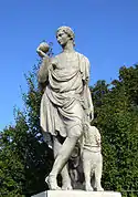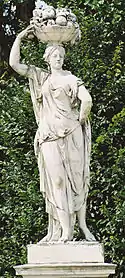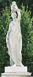 | 4 | Ceres and Dionysus | Joachim Günther | Ceres was the goddess of agriculture, marriage, and death, representing the generative power of nature.[7] She is shown with Dionysus, the god of the grape harvest, winemaking, and wine, and of ecstasy. He was the son of Zeus and Semele.[8] | ![]() |