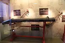 An ancient se board with four string posts, dated to the 5th-3rd centuries BC.[1] Made of wood painted in black and red lacquer, and carved with decorative patterns. The strings no longer exist.