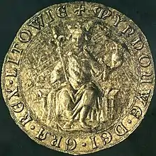 The seal is about 85 millimetres (3.3 in) in diameter (the exact size is impossible to determine because its edges have chipped off).[3] It depicts a ruler sitting on a bench, covered by a cushion or drapery. The ruler wears a royal mantle and a crown. The right arm holds a scepter decorated with a large lily, while the left arms holds an orb with a cross. The empty field around the figure is decorated with a Gothic diamond-shaped latticework. The diamonds have a tiny cross in the middle of them. The legend where Mindaugas' name and title should appear is almost completely chipped off. The only surviving details are a tiny cross, which would indicate the beginning of the legend's text, and a letter. The letter was variously read as M, D, or SI. According to the 1393 description, when the legend was still intact, it read + MYNDOUWE DEI GRA REX LITOWIE (Mindaugas by the grace of God King of Lithuania).[3]