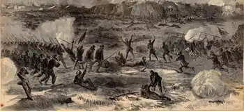 The attack, however, drew Confederate attention away from the river gate, where Ames prepared to launch his attack. At 2:00 p.m. he sent forward his first brigade, under the command of Brevet Brigadier Newton Martin Curtis, as Ames waited with the brigades of Colonels Galusha Pennypacker and Louis Bell. An advance guard from Curtis's brigade used axes to cut through the palisades and abatis. Curtis's brigade took heavy casualties as it overran the outer works and stormed the first traverse. At this point Ames ordered Pennypacker's brigade forward, which he accompanied into the fort. As Ames marched forward, Confederate snipers zeroed in on his party, and cut down a number of his aides from around him. Pennypacker's men fought their way through the riverside gate, and Ames ordered a portion of his men to fortify a position within the interior of the fort. Meanwhile, the Confederates turned the cannons in Battery Buchanan at the southern tip of the peninsula and fired on the northern wall as it fell into Union hands. Ames observed that Curtis's lead units had become stalled at the fourth traverse, and he ordered forward Bell's brigade, but Bell was killed by sharpshooters before ever reaching the fort.[18] Seeing the Union attackers crowd into the breach and interior, Whiting took the opportunity to personally lead a counterattack. Charging into the Union soldiers, Whiting received multiple demands to surrender, and when he refused he was shot down, severely wounded.[19]