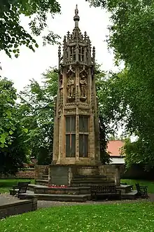 The memorial is in the Perpendicular Gothic style and is built of Ketton stone. It stands on an octagonal stepped base, and its upright is also octagonal, with buttresses and topped with finials. Its top is in a lantern form, and atop that is a cross and small shield. The front has eight niches, holding a statue representing different forces: a sailor, cavalryman, artilleryman, infantryman, imperial yeoman, militiaman, volunteer and nurse.[1][3] The initial statue of a sailor showed him holding a Lee-Enfield Magazine Rifle Mark I, which was rejected as overly aggressive, and instead installed at the library in Lichfield.[4][2]
