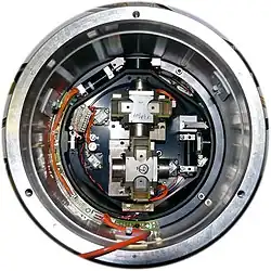 A low-frequency 3-direction ocean-bottom seismometer (cover removed). Two masses for x- and y-direction can be seen, the third one for z-direction is below. This model is a CMG-40TOBS, manufactured by Güralp Systems Ltd and is part of the Monterey Accelerated Research System.