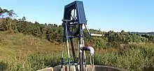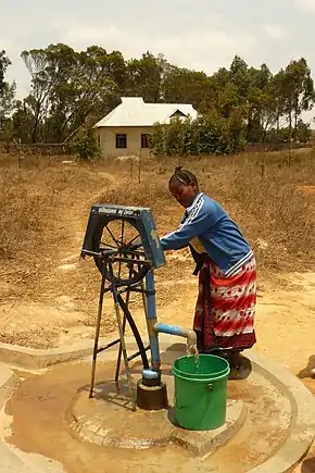 Other solutions have focused on innovative pump systems, including hand-pumps, Water for People's "Play Pumps",[17] and Pump Aid's "Elephant Pumps".[18] All three designs are built to aid communities in drawing clean water from wells. The hand pump is the most basic and simple to repair, with replacement parts easily found.[19] Using a more creative approach, Play Pumps combine child's play with clean water extraction through the use of playground equipment, called a roundabout. The idea behind this is as children play on the roundabout, water will simultaneously be pumped from a reservoir tank to either toilets, hand washing stations, or for drinking water.[18] Some downsides to the PlayPump, though, are its inability to address situations of physical water scarcity and the danger of exploitation when children's play is equated with pumping water.[20] Alternatively, Elephant Pumps are simple hand water pumps. After a well is prepared, a rope-pump mechanism is installed that is easy to maintain, uses locally sourced parts, and can be up and running in the time span of about a week.[18] The Elephant Pump can provide 250 people with 40 litres of clean water per person per day.[21]