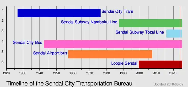 38°16′9.4″N 140°51′45.32″E / 38.269278°N 140.8625889°E / 38.269278; 140.8625889 Sendai City Transportation Bureau (仙台市交通局, Sendai-shi Kōtsūkyoku) is a public transport organization in Sendai, Japan. The organization operates subways and buses within the city. It was founded in 1926.