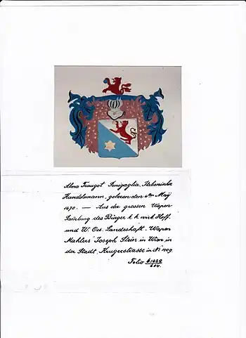 Gorizia branch crest.The golden coins seen on the red part of the crest are a family legend: they would have been lent to Napoleon, and never returned. In exchange of the loan, the Emperor would have granted the right of displaying the gold on the crest for as long as the loan was not paid back[11]