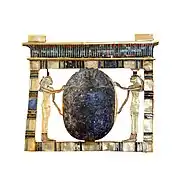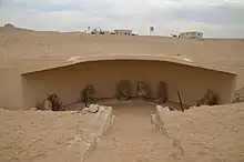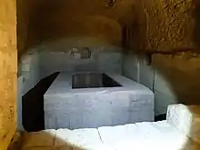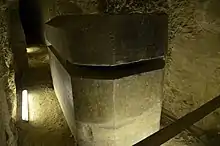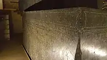 Blocking the original entrance to the Greater Vaults is the "grey granite" sarcophagus dedicated by Cambyses II (c.530 BC), first Persian ruler of Egypt. Only its lid is inscribed.[49]